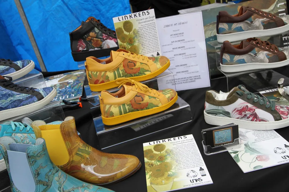 Wie wil rondlopen met de Nachtwacht of het Melkmeisje op zijn schoenen moet bij Peter Heerkens zijn. “Onder de merknaam Linkkens (art sneakers) verkoop ik schoenen die zijn gemaakt van gerecyclede petflessen en plantaardig gelooid leer. Mijn ontwerpen worden gemaakt in Portugal en Italië.