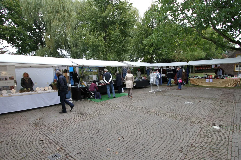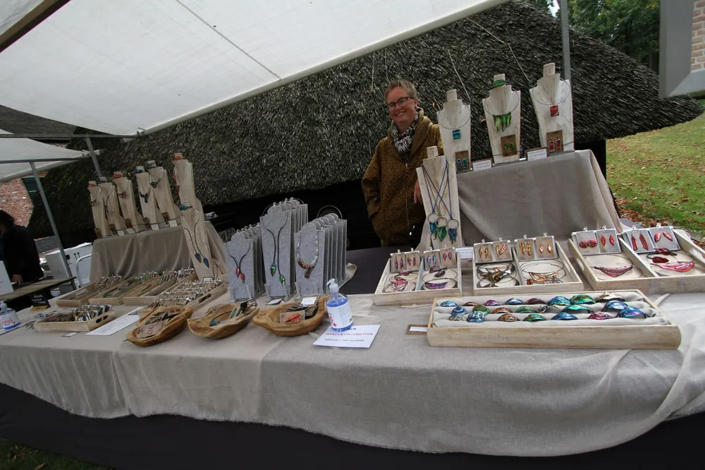 De eerste Zeldzaam Mooi Museum Markt bij Museum ’t Oude Slot is lekker ruim van opzet. Er zijn bijzondere producten te proeven, te zien en te koop. Zo verkoopt Tineke Strating er haar unieke zelfgemaakte sieraden. Duur? Dat valt mee. De prijzen liggen tussen € 12,50 en € 39,50. Het was zaterdag nog niet druk op de markt. “Ik merk wel dat de mensen blij zijn dat er weer iets georganiseerd wordt”, zegt Strating. Iedereen kan bij de kramen de handen ontsmetten voordat men iets aanraakt.