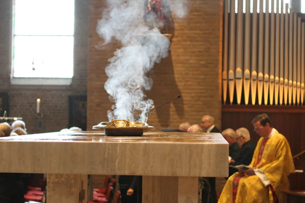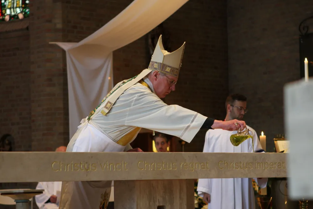 Een goed gevulde kerk zag dat kort na 11.00 uur de bisschop met zijn blote hand het nieuwe altaar zalfde met het heilig chrisma (Grieks voor zalf). Na de bewieroking van het altaar werd het met doeken afgedroogd en feestelijk versierd met onder meer kandelaars met kaarsen en het kruis.