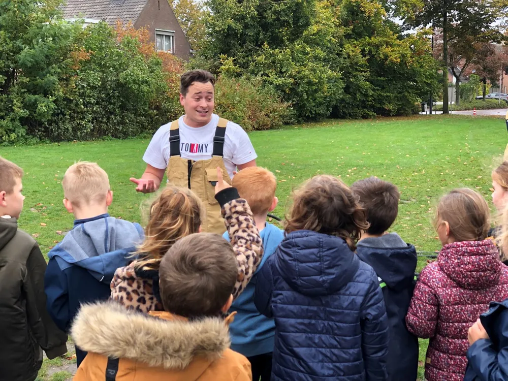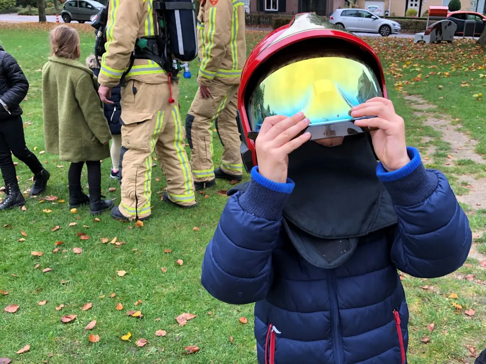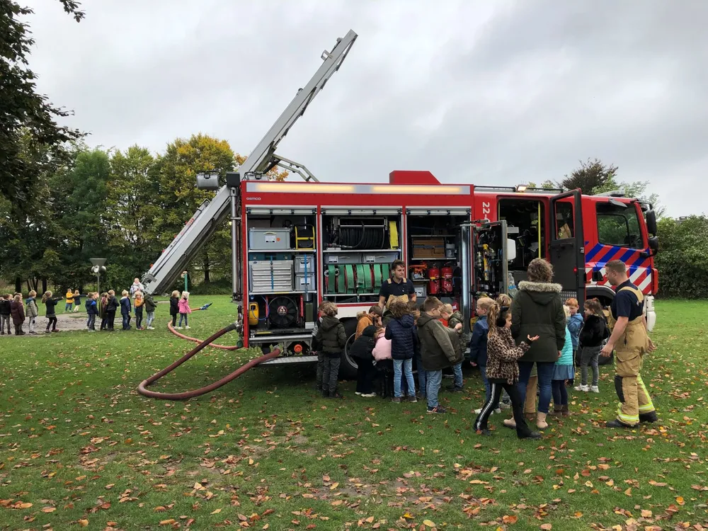 “Wie weet wat de brandweer doet?”, vraagt een brandweerman. Het groepje kinderen barst los. “Branden blussen. Auto’s openmaken. Koeien uit de sloot halen.” In drie groepen verdeeld krijgen de kinderen volop informatie van de brandweermannen. Ze krijgen uitleg over het brandweerpak en de uitrusting van een brandweerman. Ze mogen rondlopen met een brandweerhelm op en een warmtebeeldcamera.