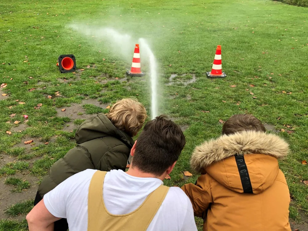 Natuurlijk mogen ze even in de brandweerauto plaatsnemen. De spreider, die gebruikt wordt om een auto open te knippen, is erg zwaar merkt de jeugd als ze die even mogen optillen. Het leukst vonden ze misschien wel om met een brandweerslang oranjekleurige pylonen omver te spuiten.