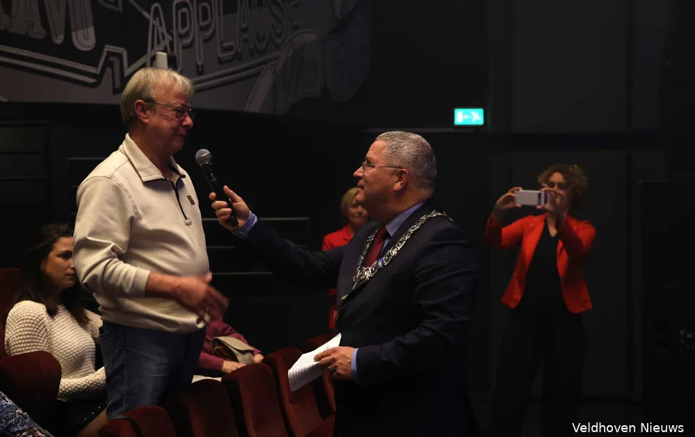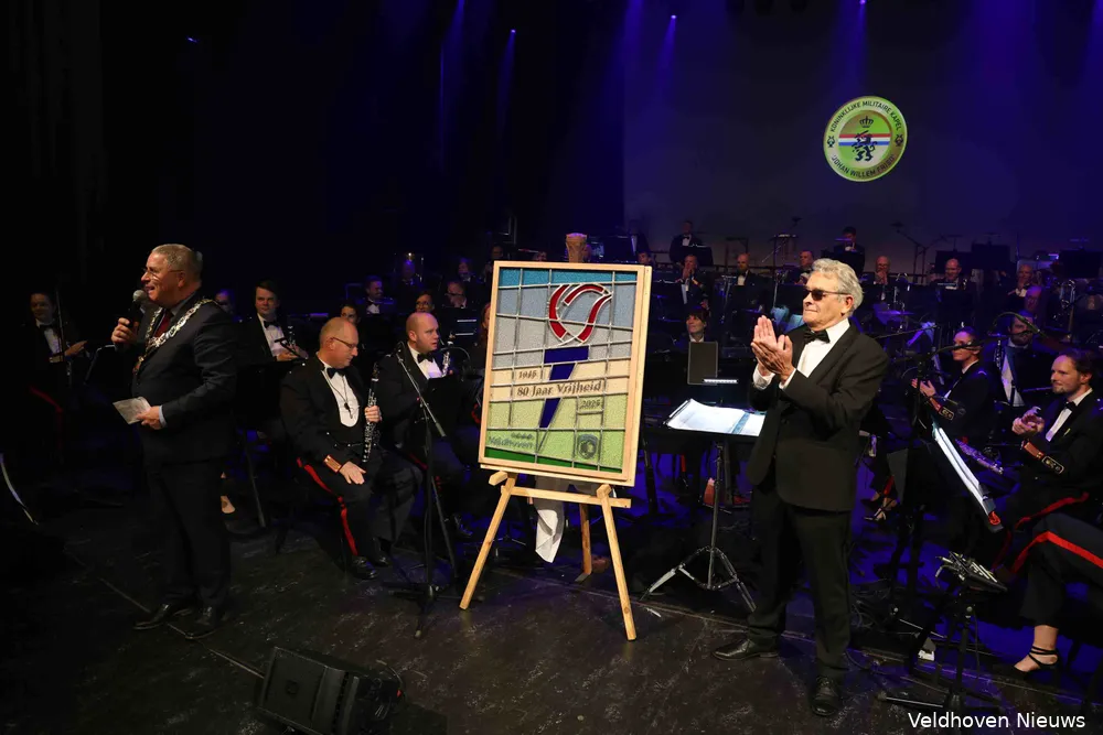 Namens de gemeente nam burgemeester Marcel Delhez een bijzonder glas-in-loodkunstwerk in ontvangst. Het is in opdracht van de harmonie gemaakt door glas-in-loodmeester Michael Regenhardt. Op het kunstwerk staat een toorts met de bevrijdingsvlam en de logo’s van de gemeente Veldhoven en de harmonie.