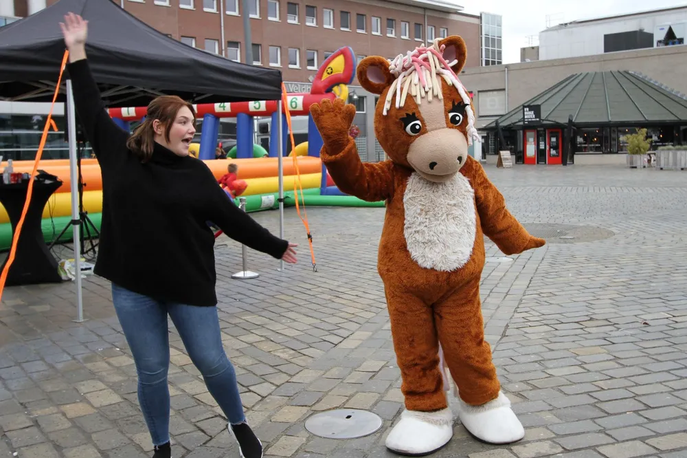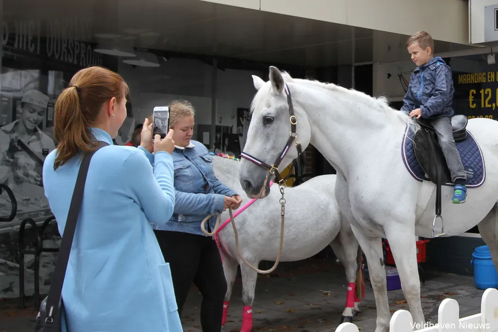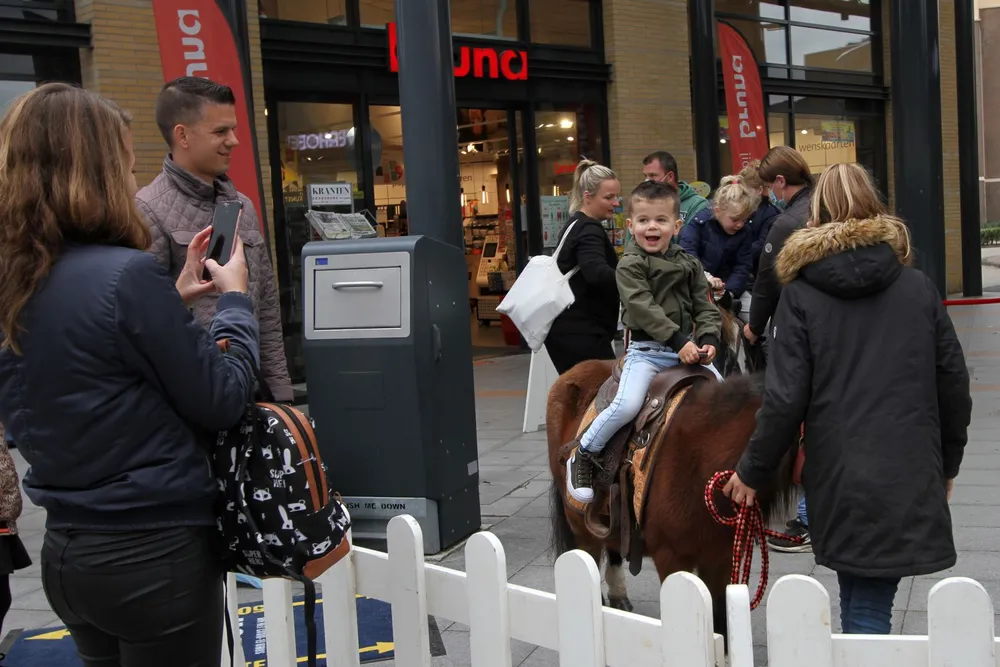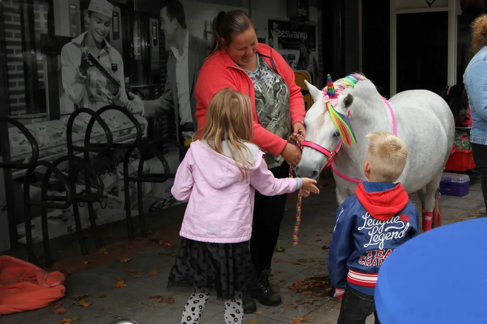Op het plein voor de Bruna grepen veel kinderen de kans om een ponyritje te maken. De echte durfals beklommen een stukje verderop de rug van een groot paard om vervolgens op de foto gezet te worden. Vooral de meisjes werden bij een unicorn op de foto gezet.