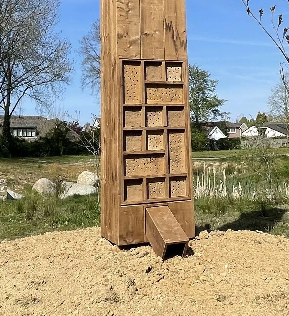 Het onderkomen is onderin voorzien van een bijenhotel. Bovenin zijn enkele spleten en gaten zichtbaar, wellicht zijn dat ingangen voor vleermuizen. En helemaal onderin lijkt ook iets naar binnen te kunnen...