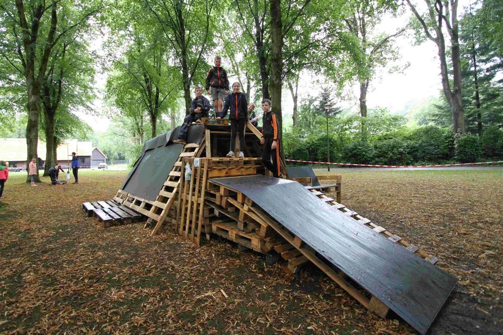 Op het terrein aan de Heerseweg vindt deze week de Huttenweek van het Vakantiewerk Veldhoven plaats. Dinsdag werd begonnen met het bouwen van hutten. En die bouwsels mogen er zijn. Maar liefst 8 weerbestendige onderkomens sieren het terrein. Cas, Jori, Roan en Twan maakten samen ook een hut en wonnen er zelfs de eerste prijs mee.