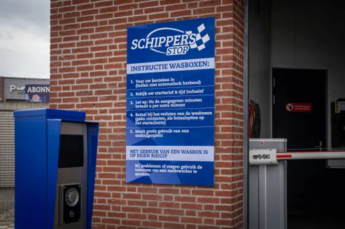 de wasbeurt, bij het verlaten van de wasbox via de uitgangsslagboom, kan er met